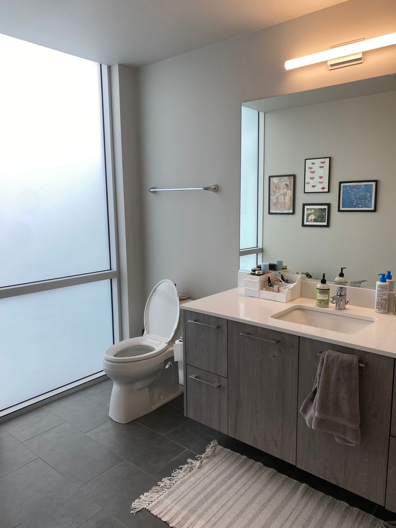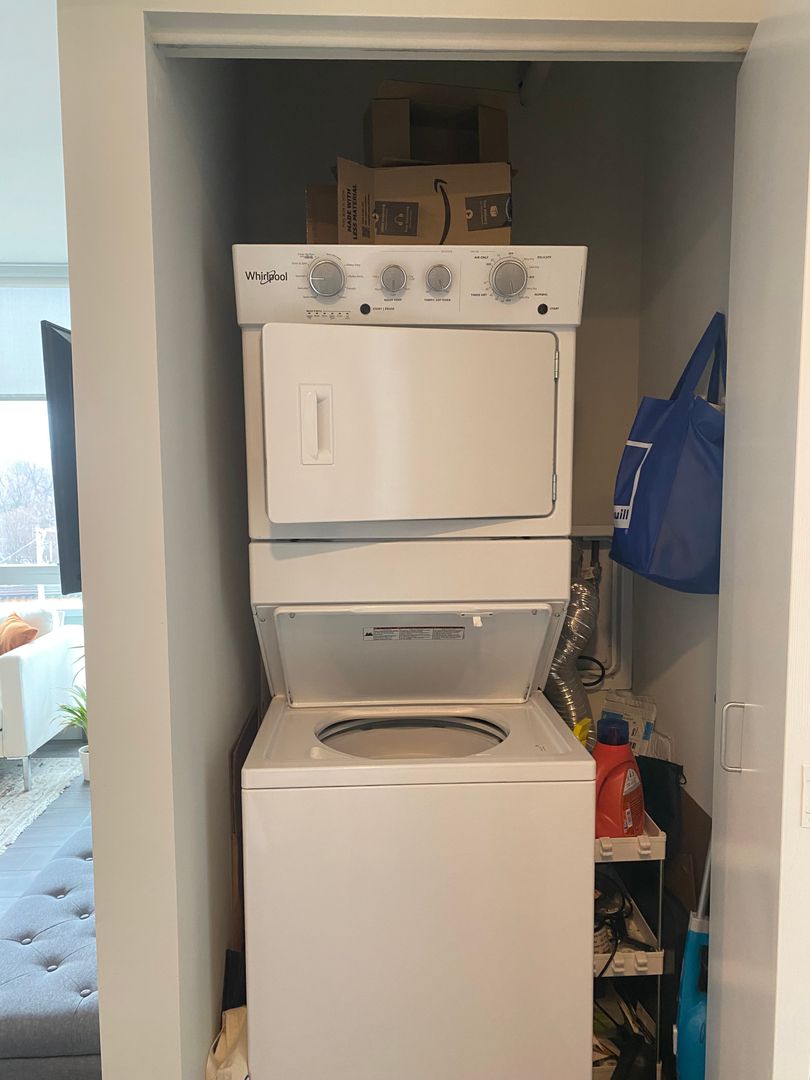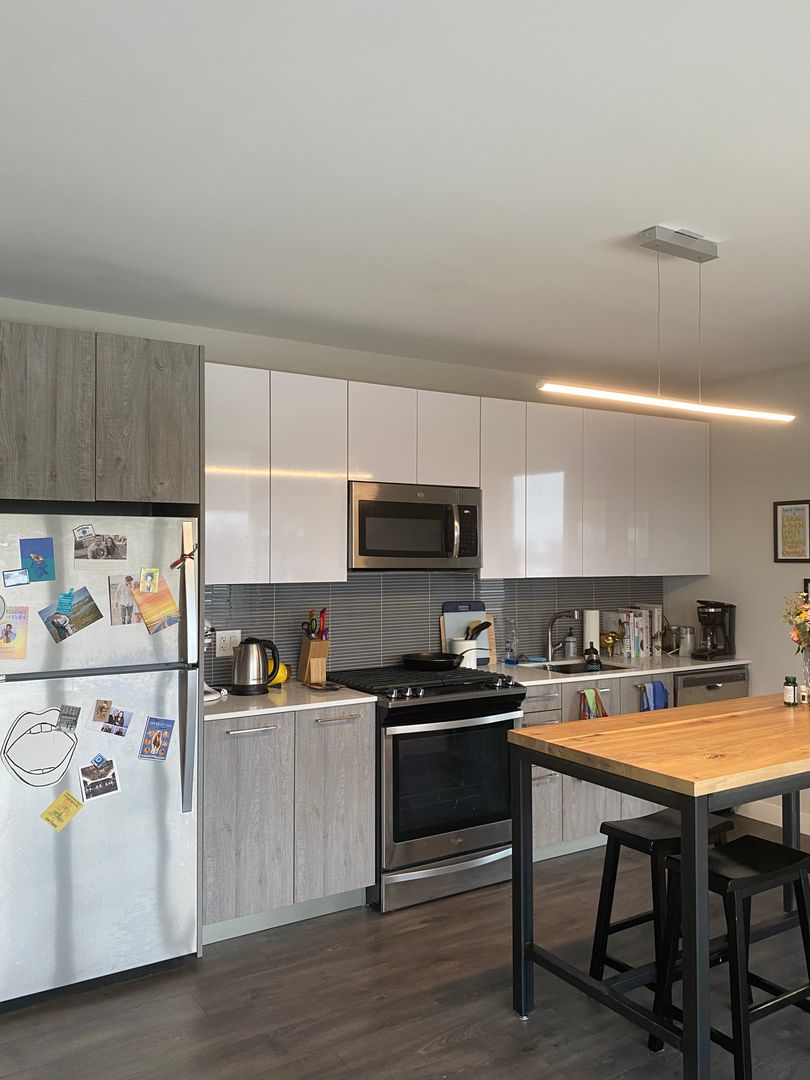 This property features premium finishes, including Abaco by Snaidero soft-close cabinetry, Balterio gray-tone plank flooring, and stainless-steel Whirlpool appliances. The kitchen and bath are adorned with Kohler fixtures, Pearl Quartz countertops, and a Daltile glass mosaic backsplash. Frameless glass shower doors and private balconies or terraces (in select units) add luxury, with full-size stackable in-unit Whirlpool washers/dryers and commercial solar shades on all windows providing convenience. Custom built-in closet systems and integrated USB ports in the kitchen and bedroom complete the modern design.