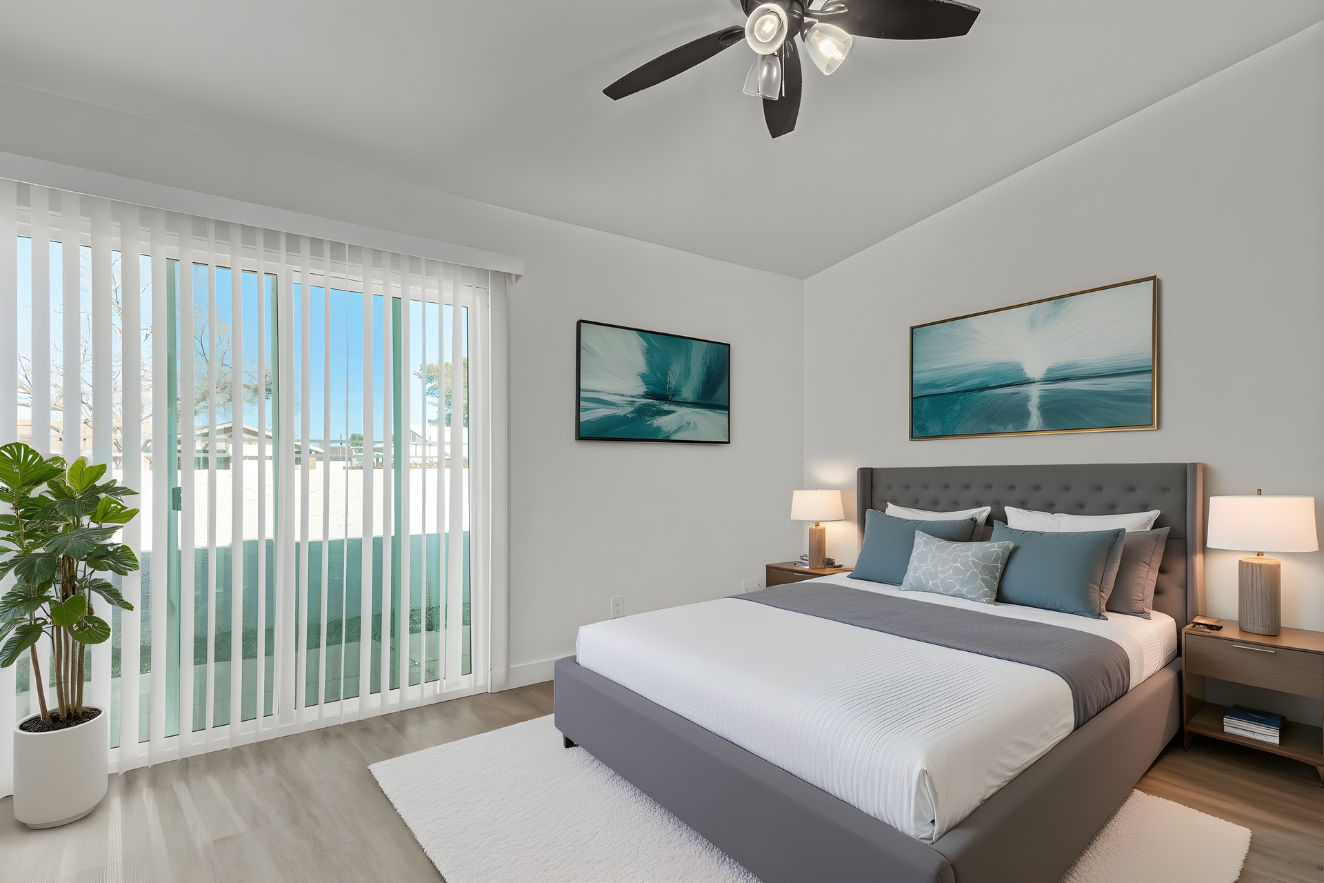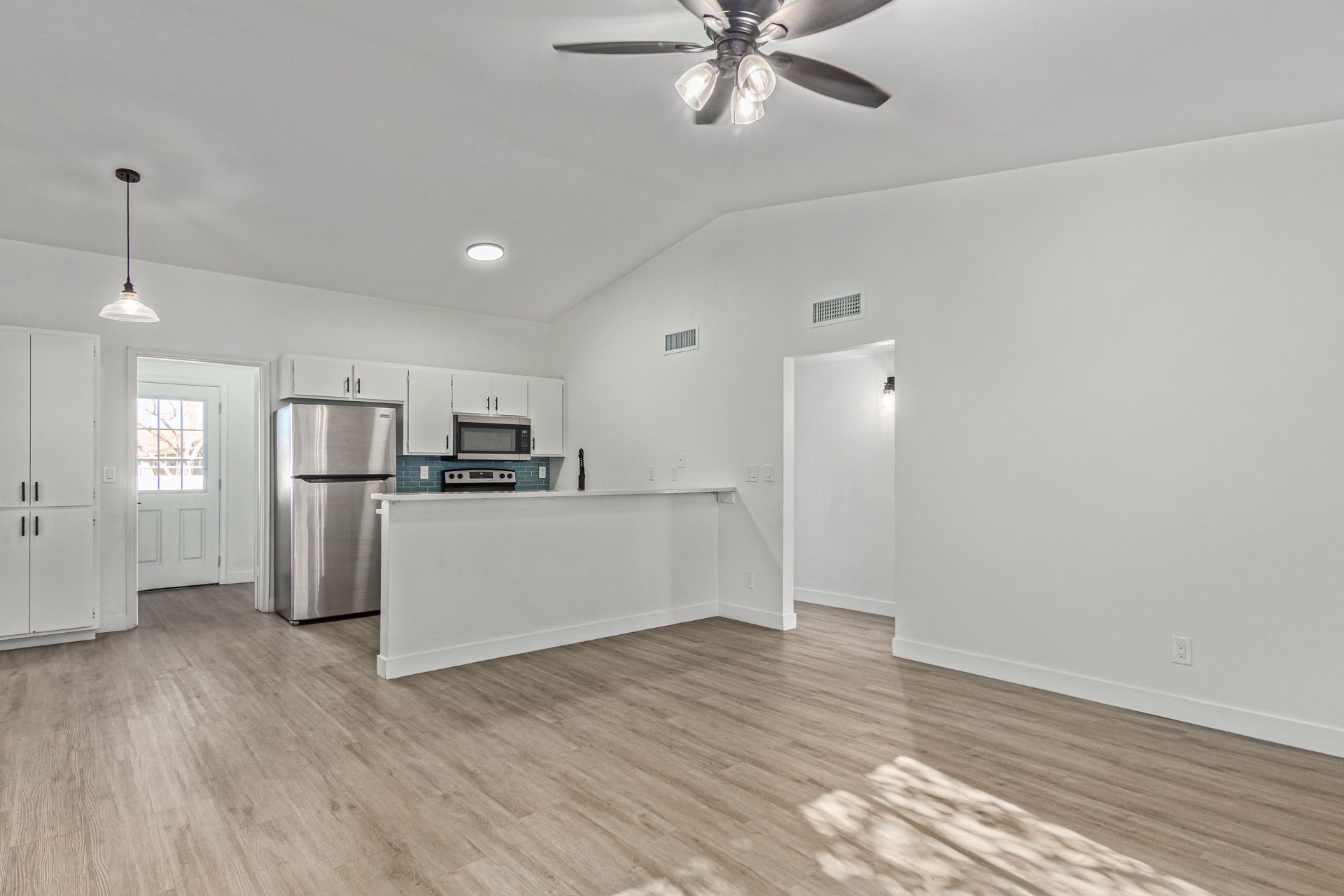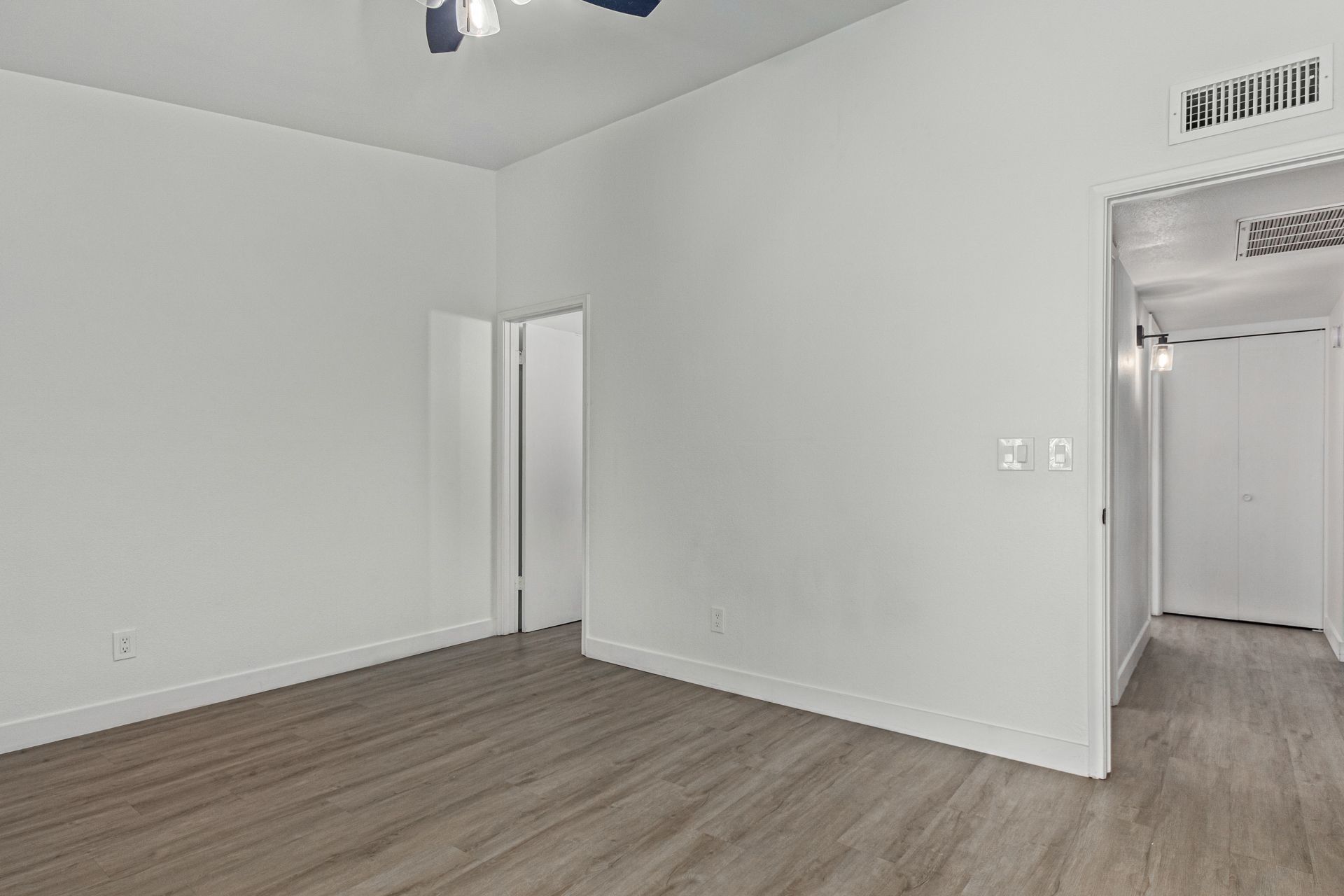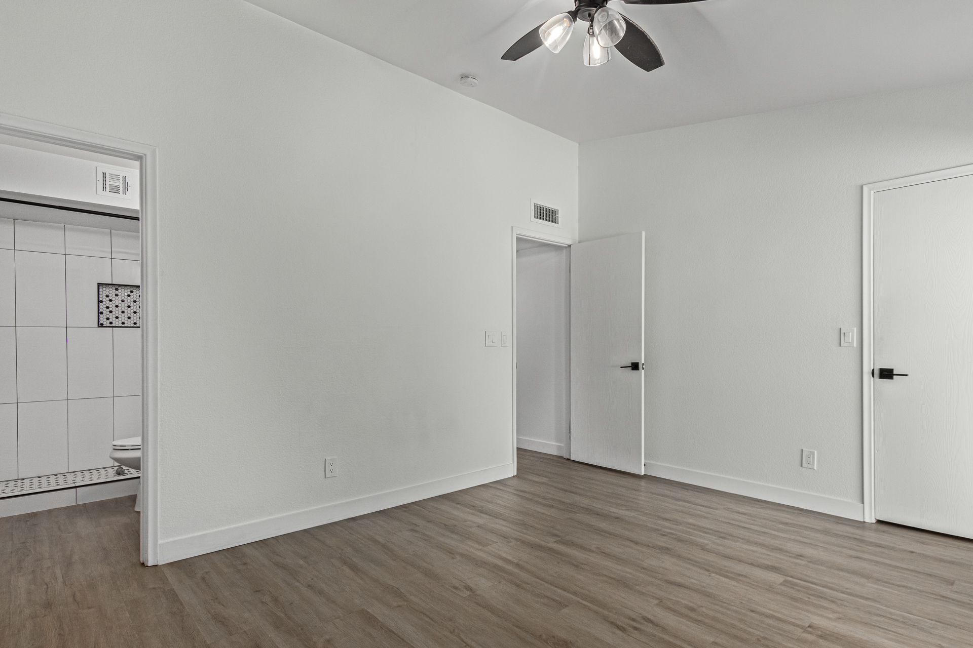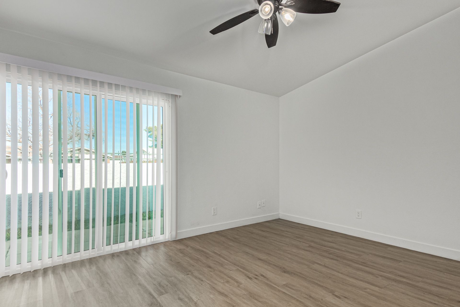 The inside of our units are as spectacular as the outside. Each apartment has high, vaulted ceilings in the living rooms and bedrooms! Our master bedroom has a walk in closet and doors that open up to a large private patio.