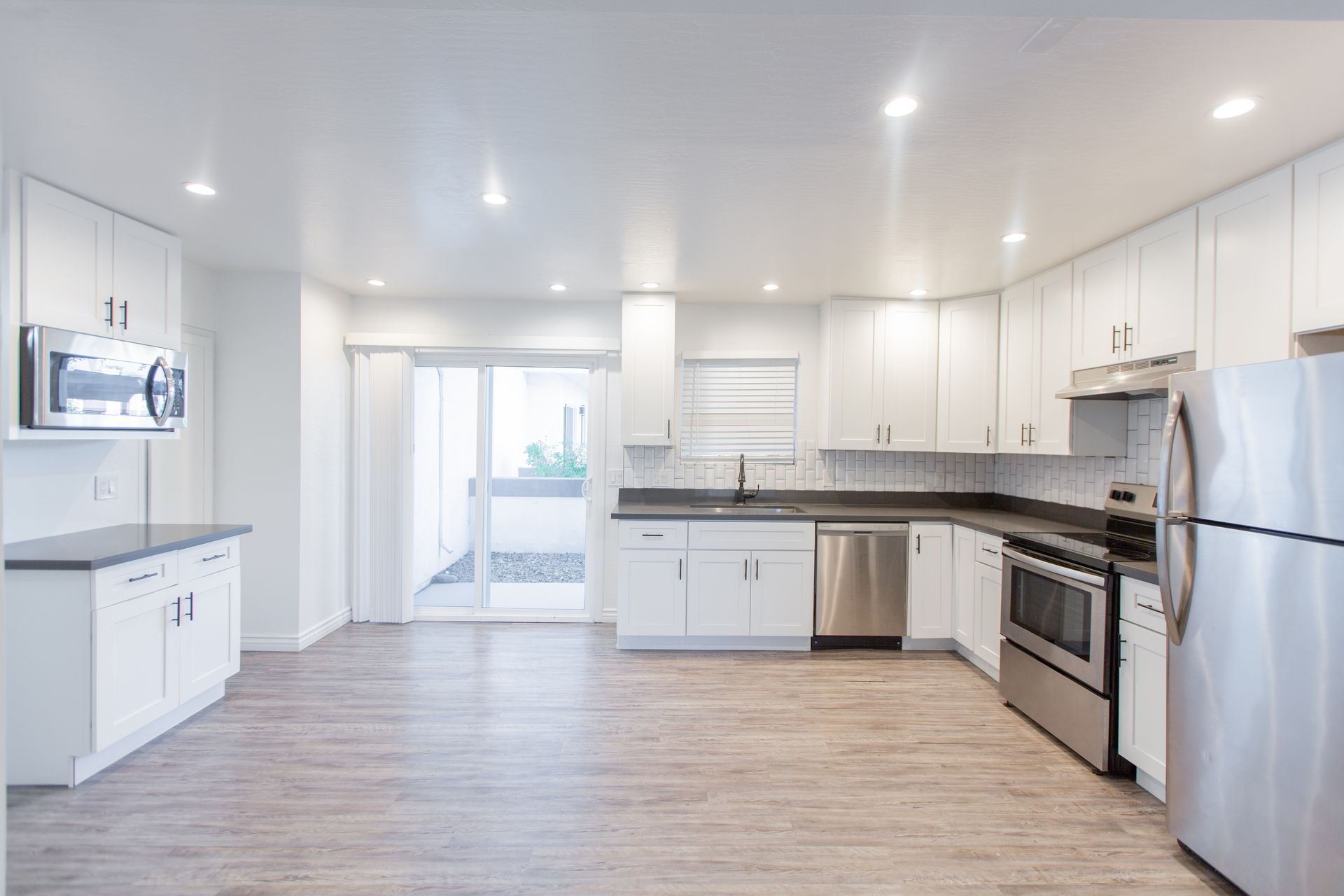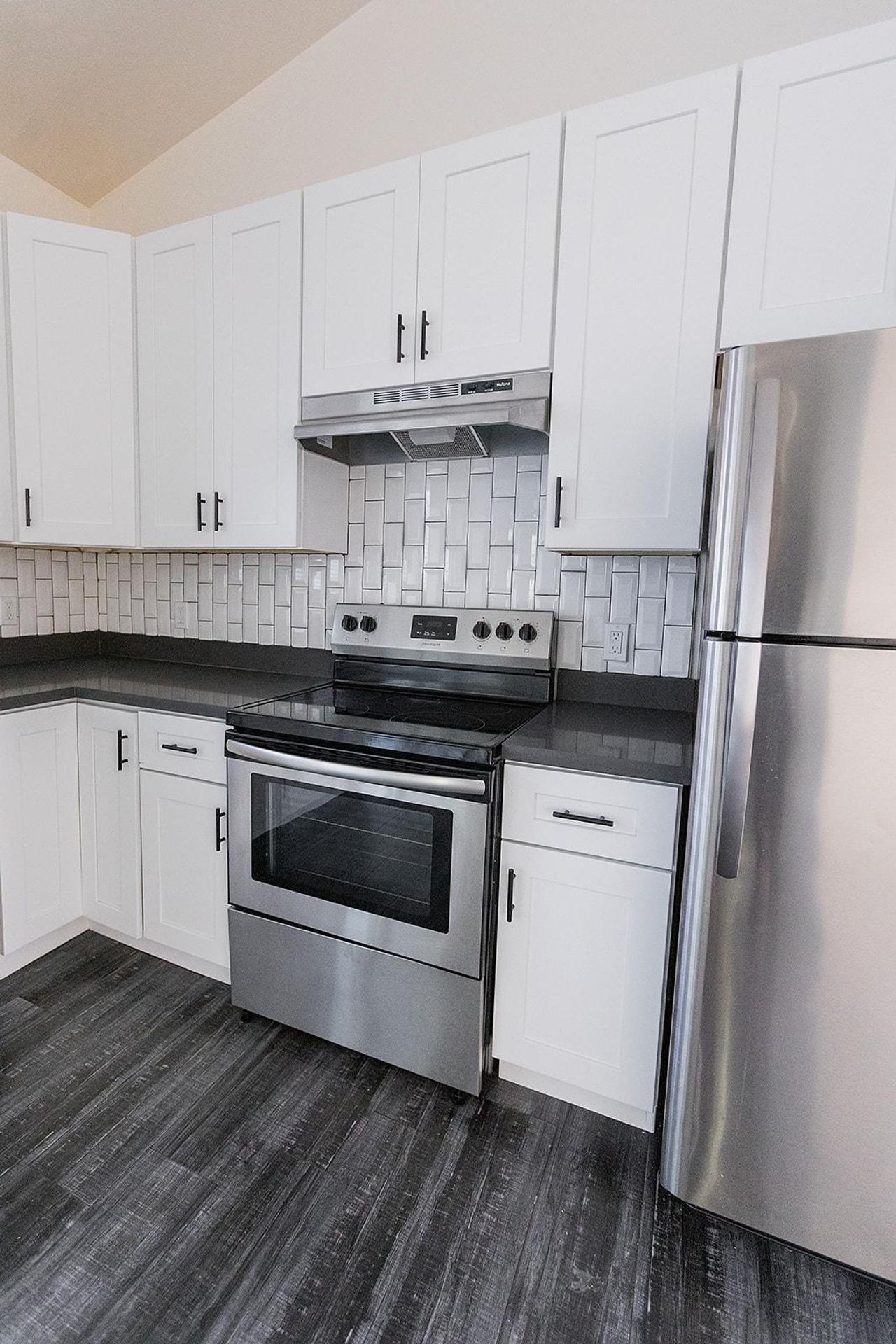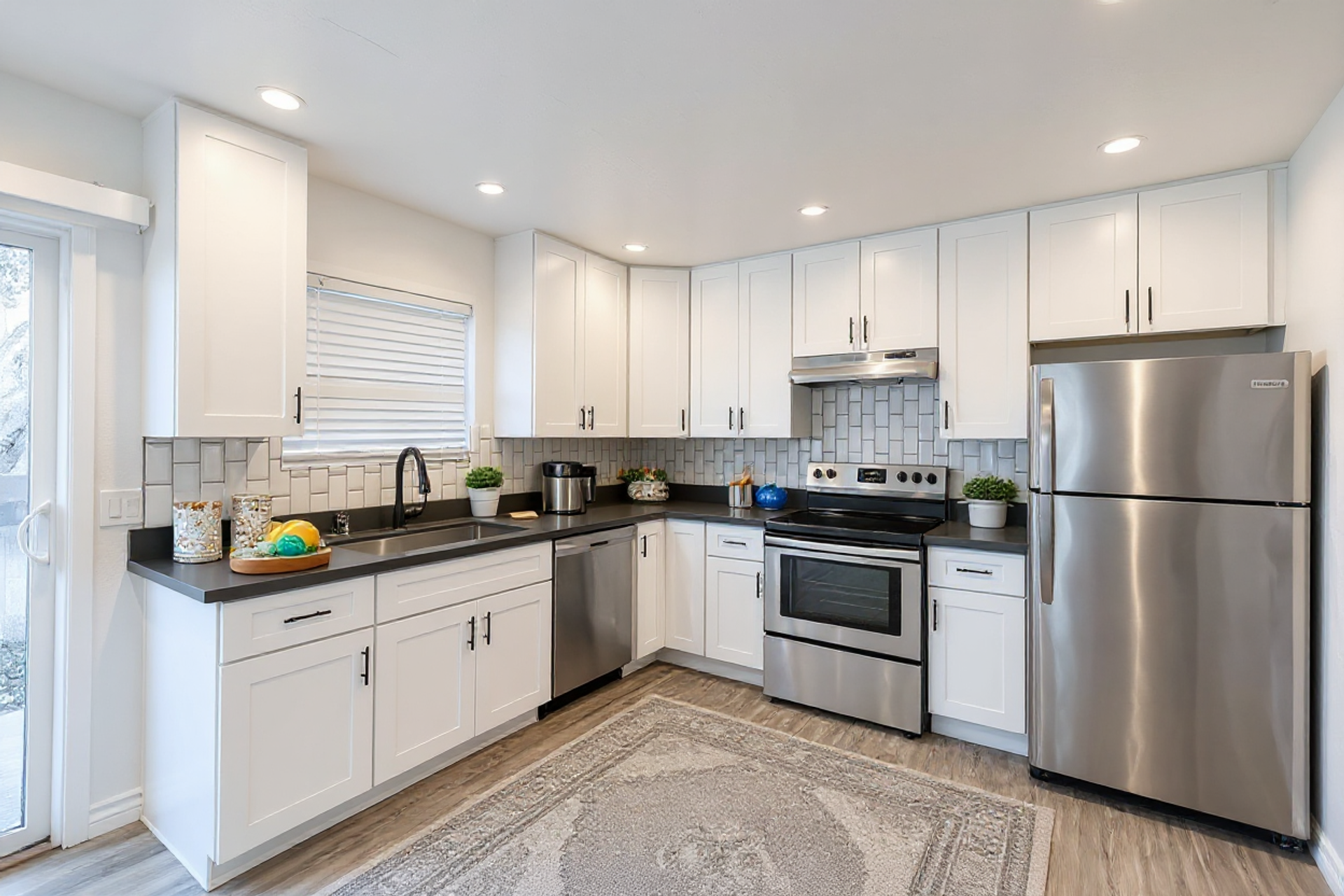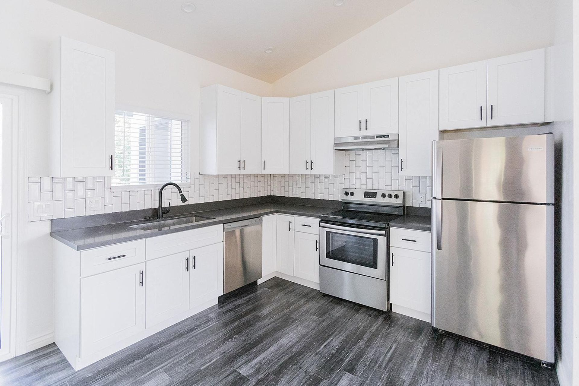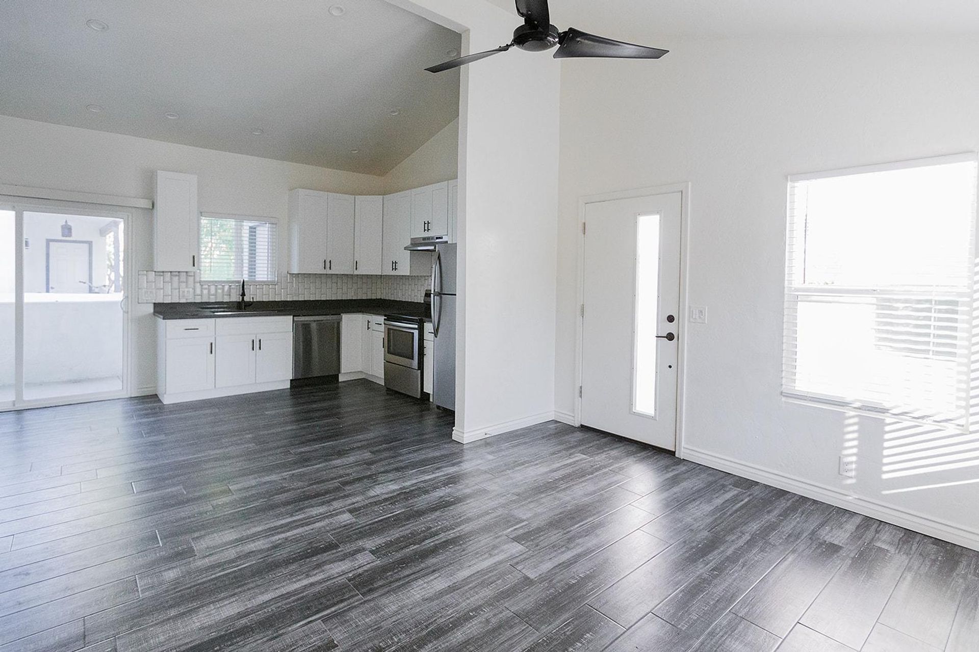 This pristine 2BR/2BA boasts a private patio, vaulted ceilings, stainless steel appliances, shaker cabinets quartz countertops, and subway tile surrounds in the kitchen and bath, plank flooring throughout and a fireplace!