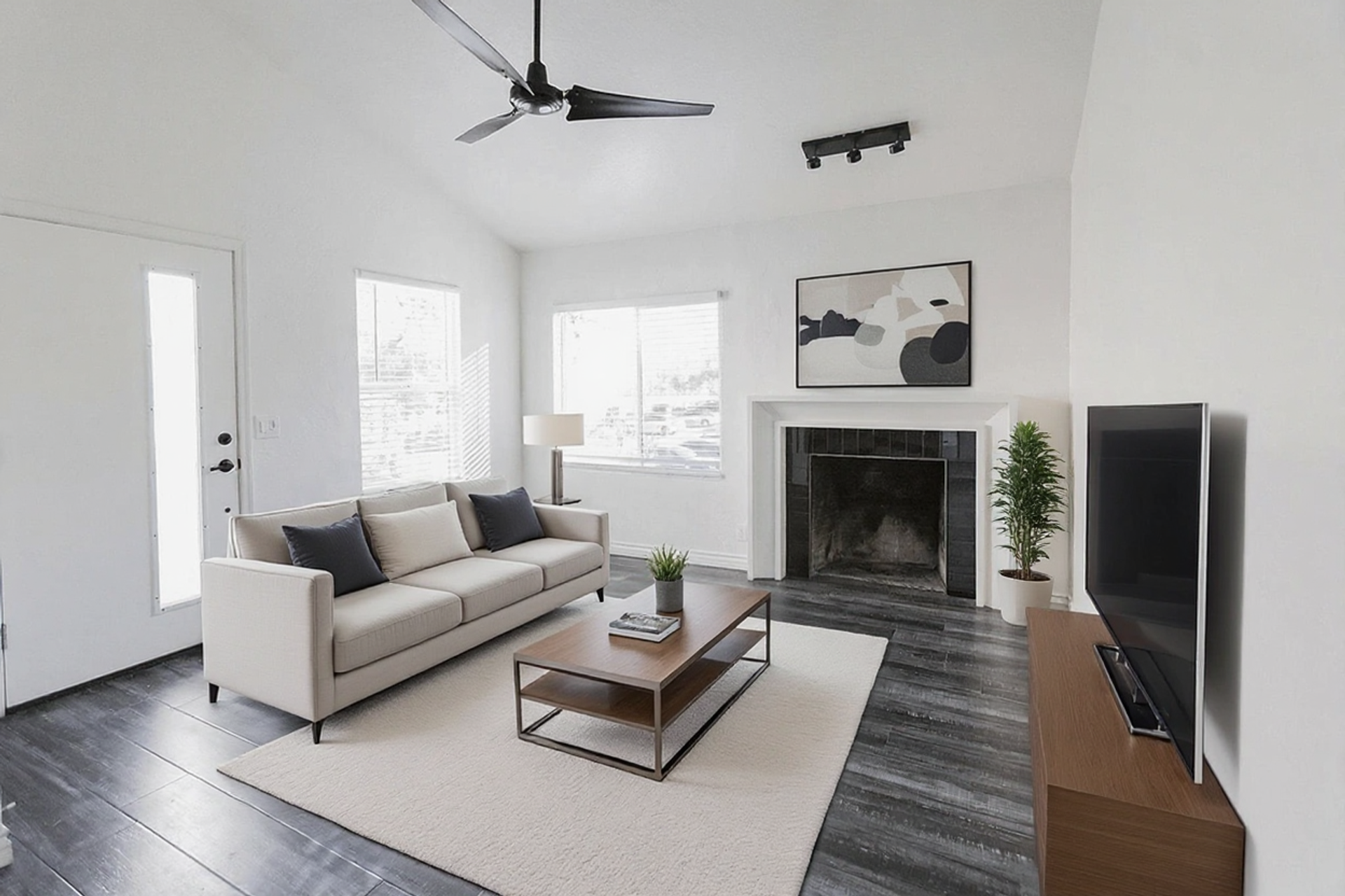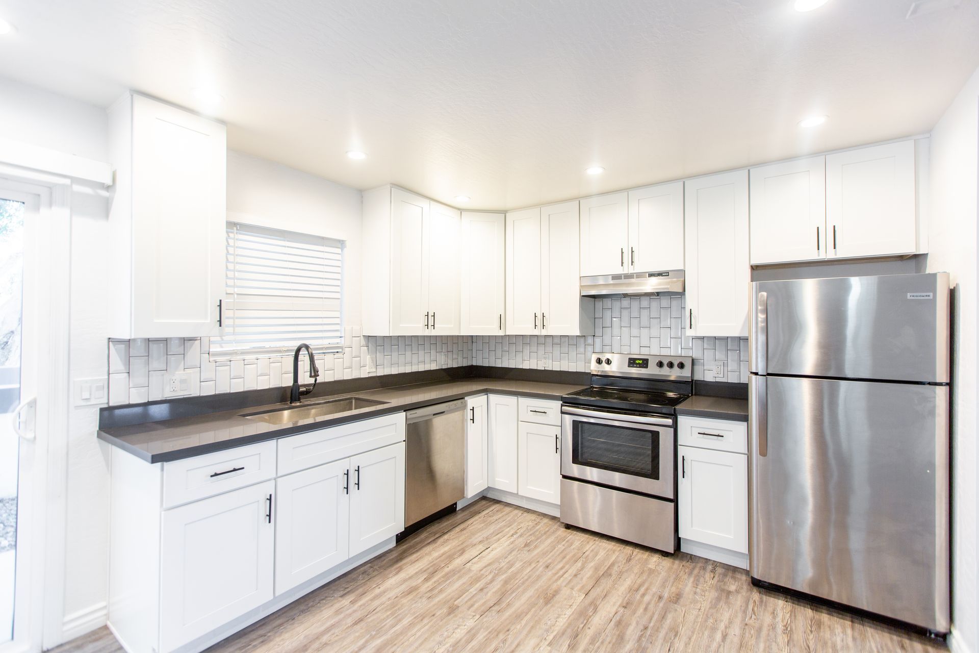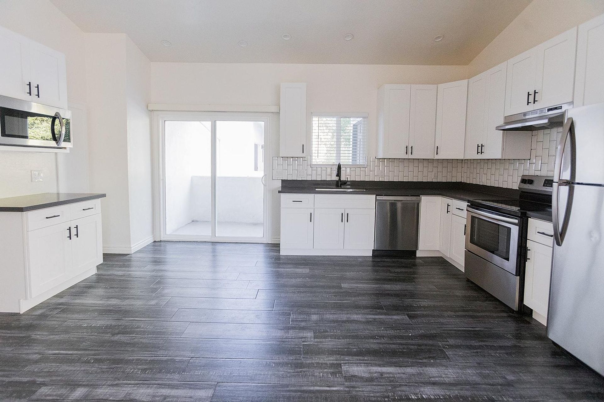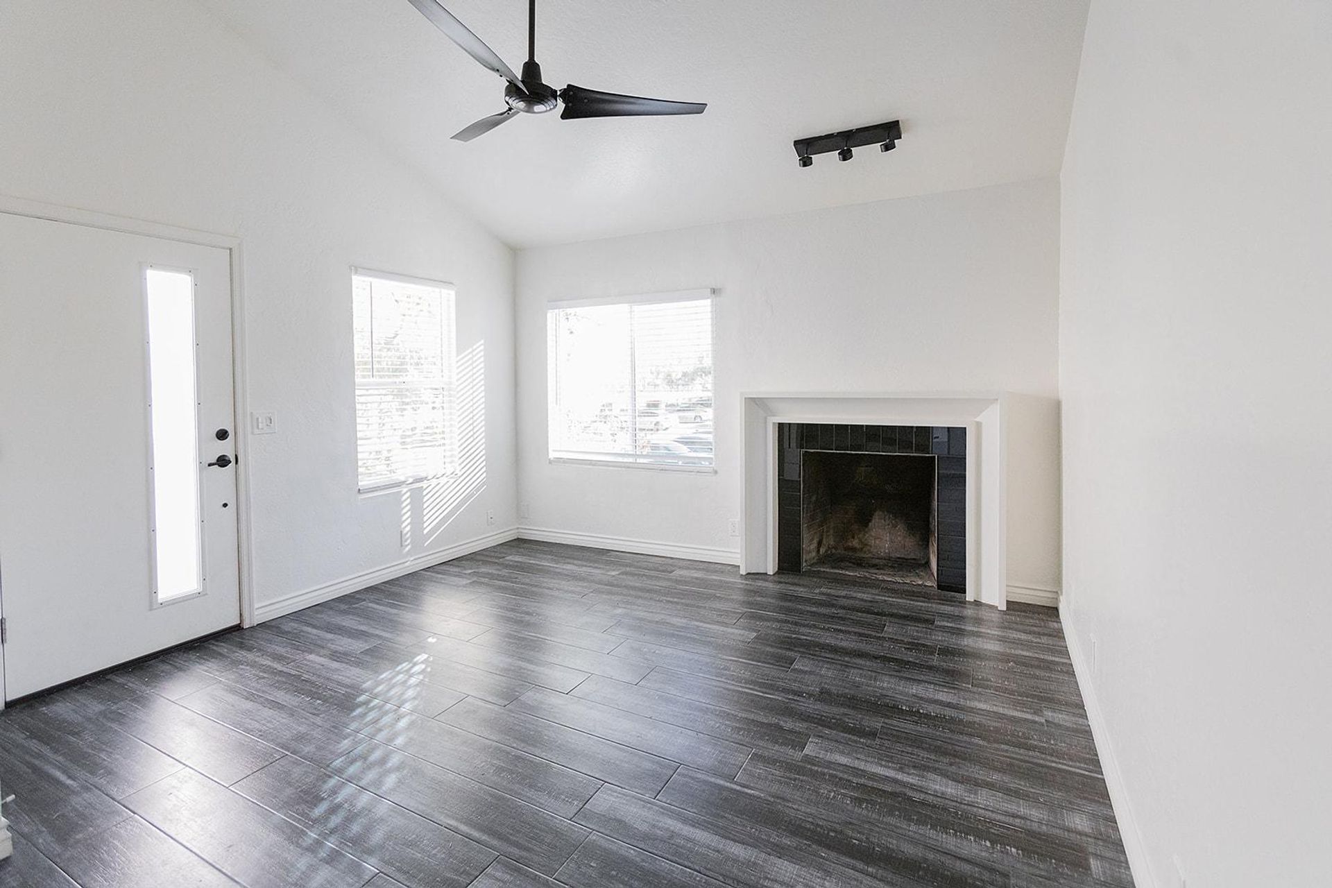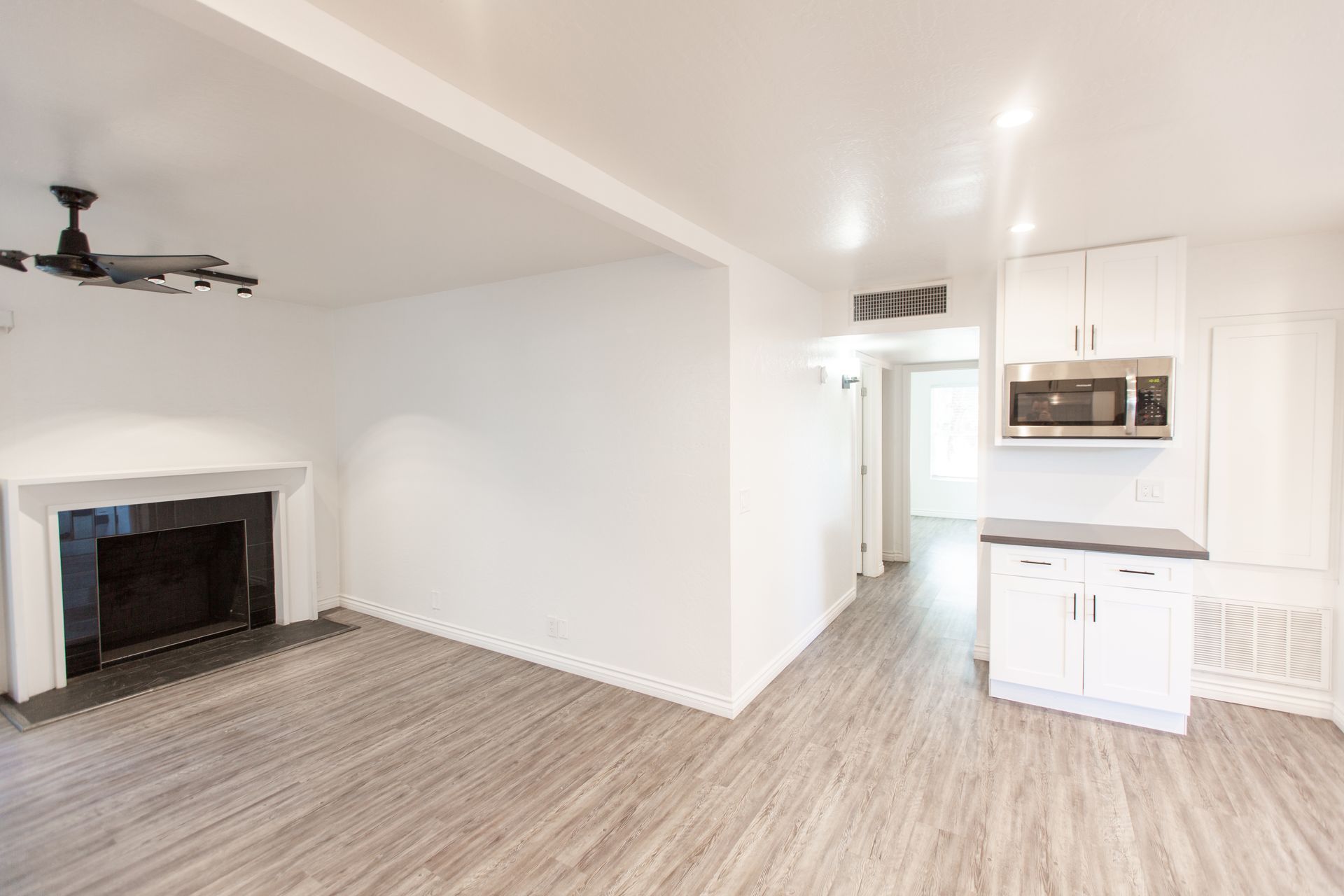 This pristine 2BR/2BA boasts a private patio, vaulted ceilings, stainless steel appliances, shaker cabinets quartz countertops, and subway tile surrounds in the kitchen and bath, plank flooring throughout and a fireplace!