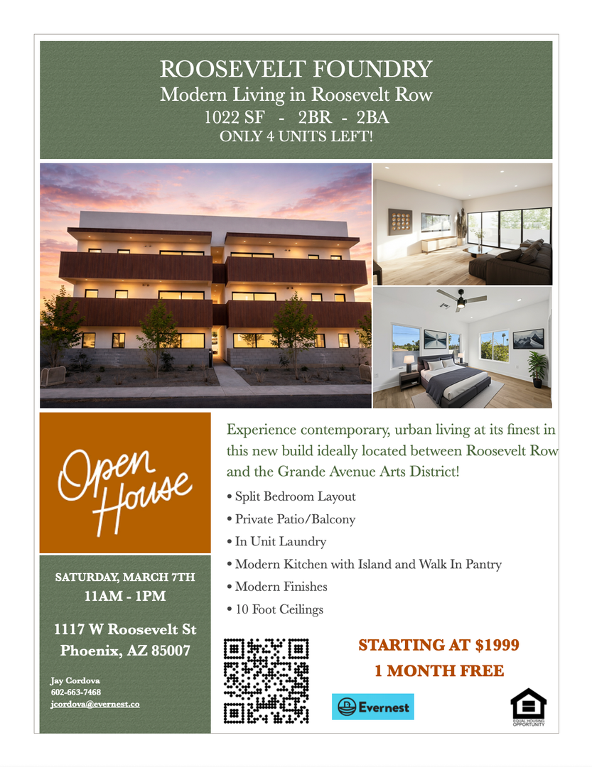 Experience contemporary urban living at its finest in this brand new 6-unit apartment building, ideally located at 1117 Roosevelt in downtown Phoenix. Each spacious unit offers 1,200sf of thoughtfully designed living space, 2 bedrooms and 2 bathrooms—perfect for professionals, couples, or small families. You will also have and 172sf of private outdoor space!