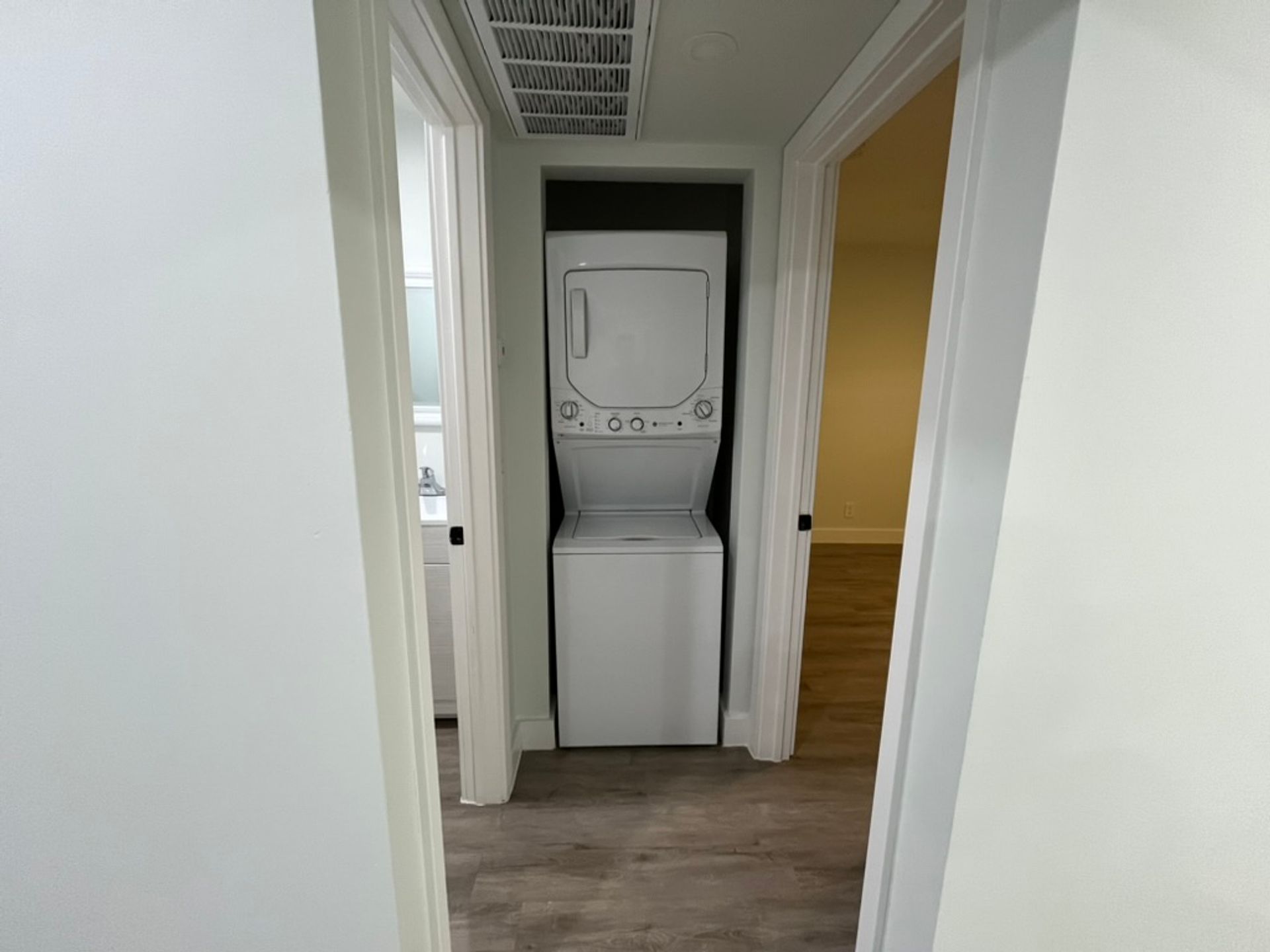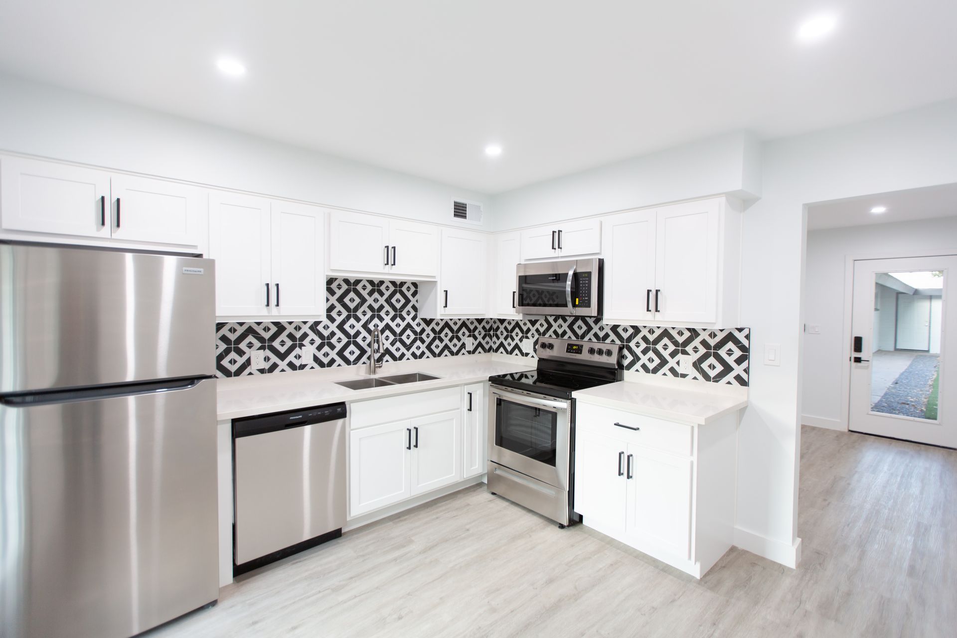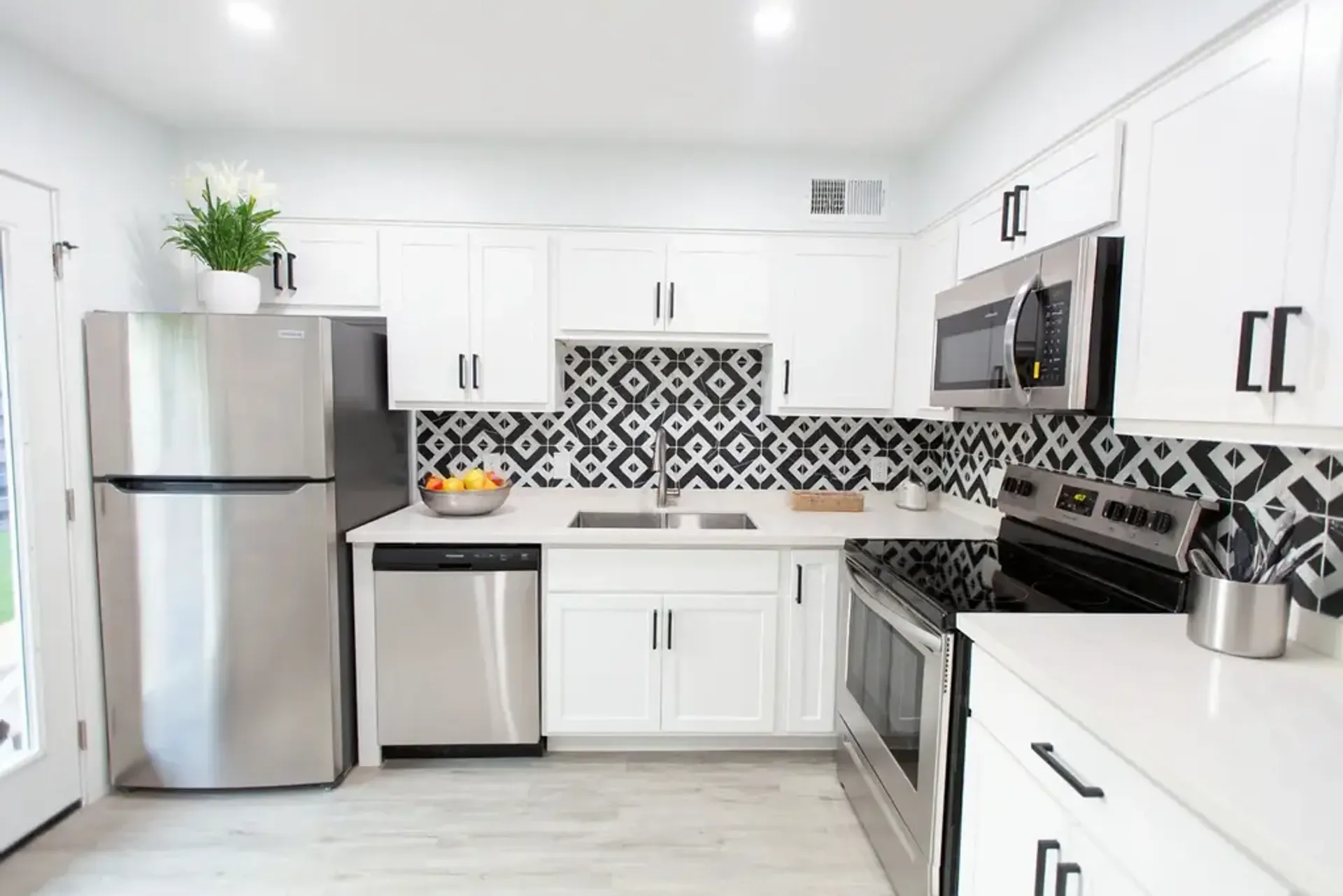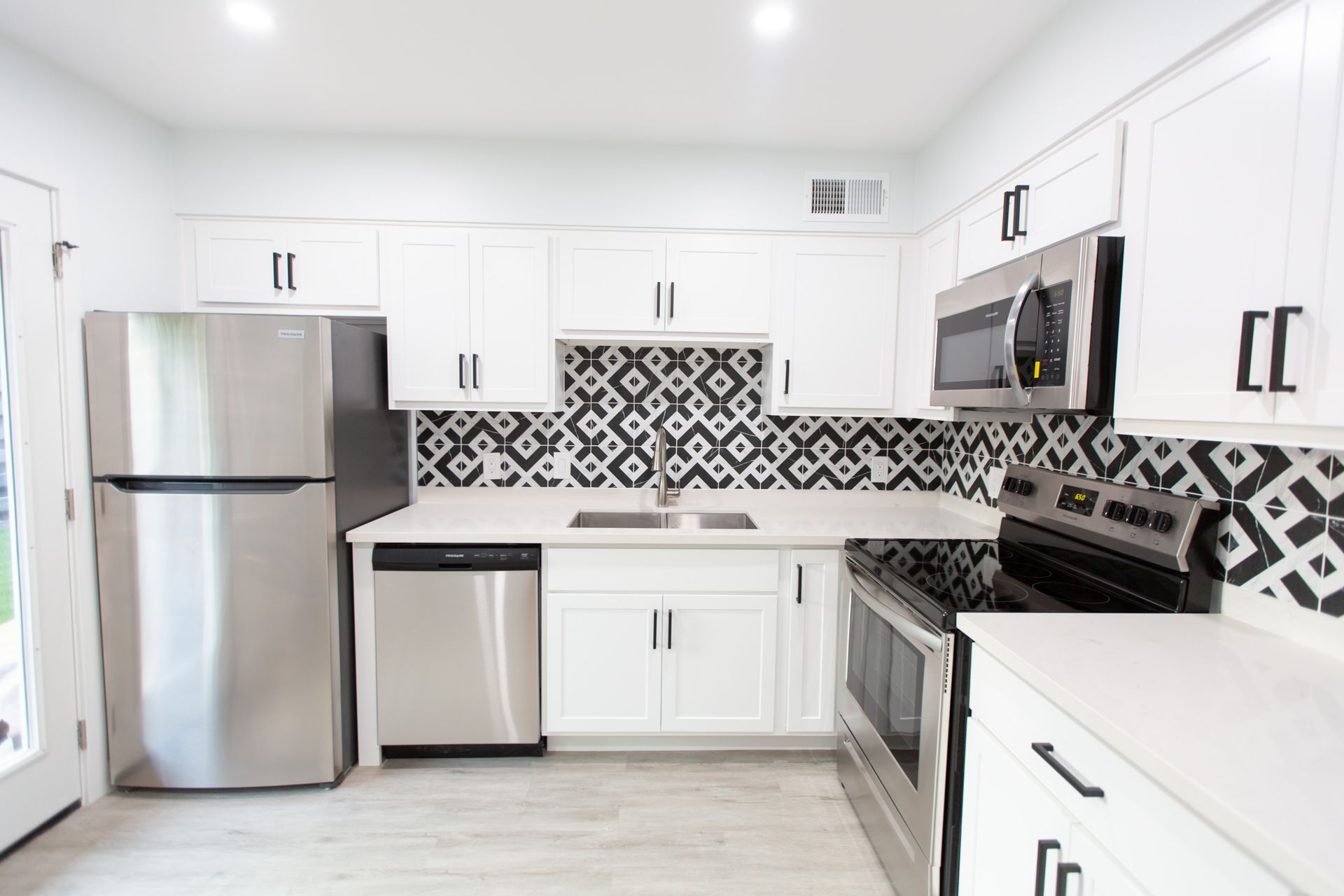 Inside, you'll find a designer kitchen equipped with elegant shaker cabinets, quartz countertops, a stylish backsplash, and sleek vinyl plank flooring throughout. Every detail has been carefully curated to create a modern yet inviting atmosphere.